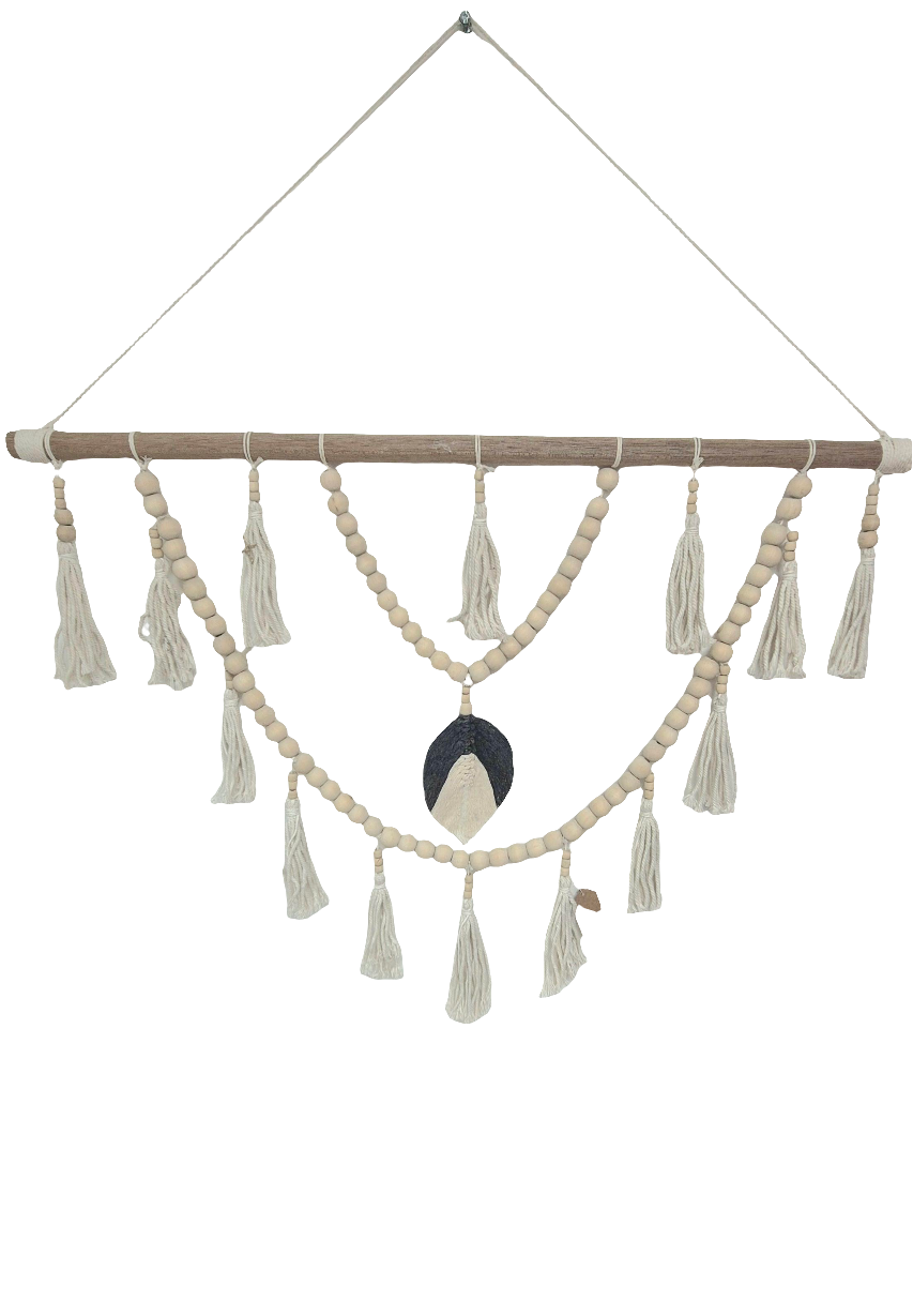 Cette décoration murale allie la beauté naturelle du bois et l'élégance artisanale du macramé pour créer une pièce unique et chaleureuse. La structure en bois, ornée de perles délicates, soutient des fils de macramé tissés à la main, apportant une touche bohème et raffinée à votre intérieur. Parfaite pour ajouter une note de douceur à votre salon, chambre ou entrée, elle s’intègre facilement dans des décors modernes, scandinaves ou bohèmes.