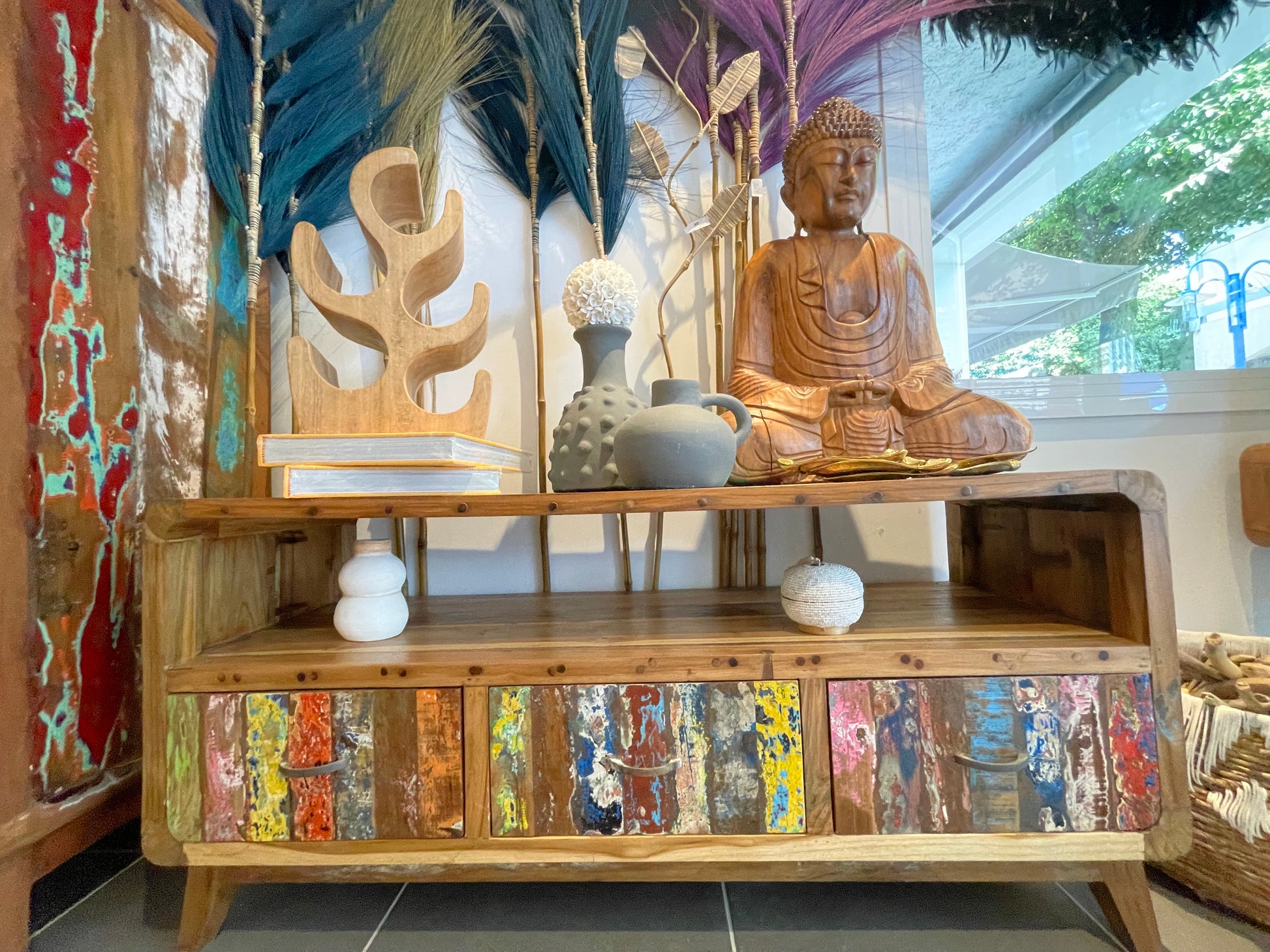 Découvrez l’authenticité et le caractère unique de notre meuble télé, fabriqué à partir de barques recyclées d’Indonésie. Chaque pièce est une œuvre d’art à part entière, présentant des variations de couleurs vives qui racontent l’histoire des mers et des rivières indonésiennes.