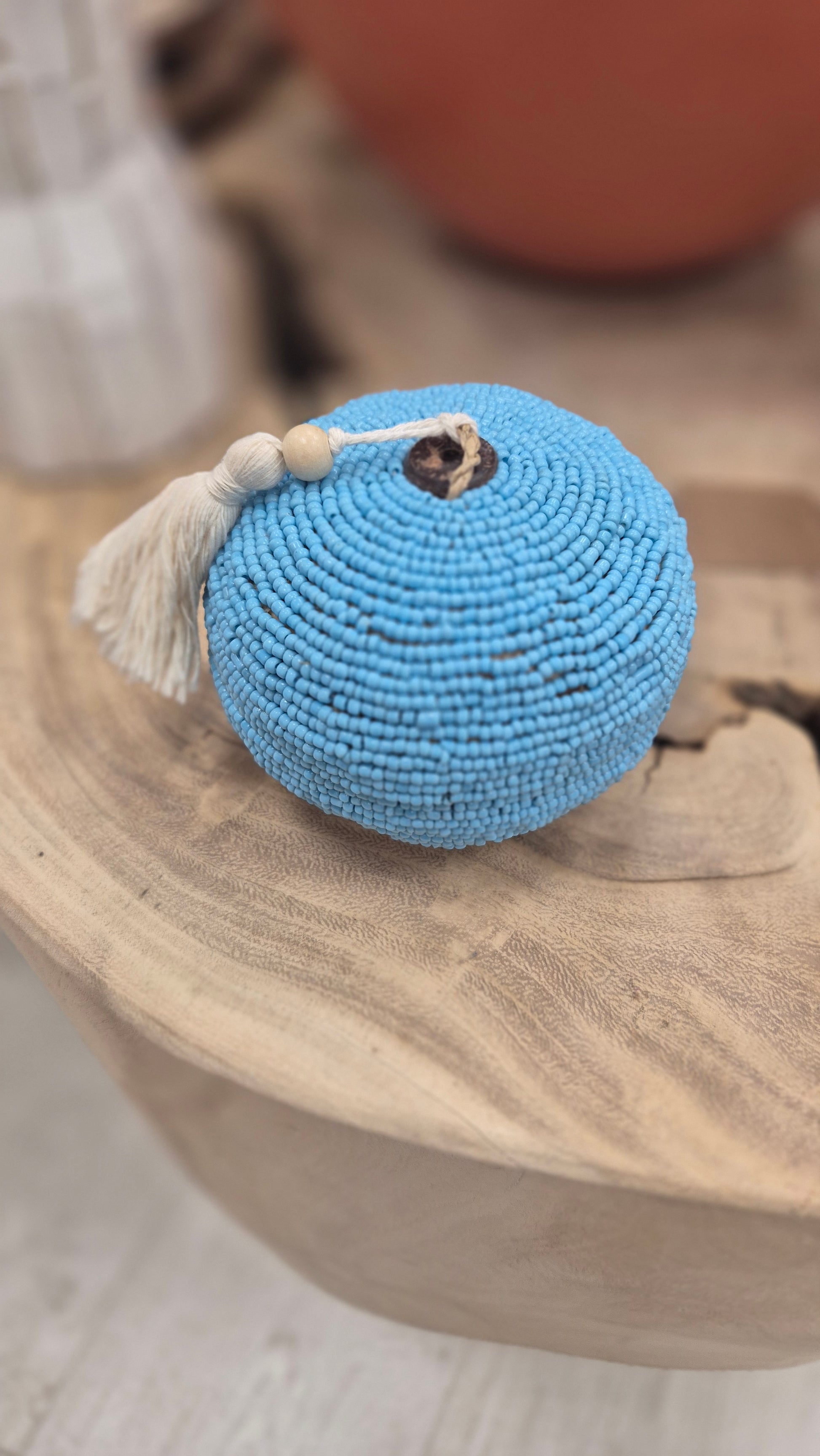 Petite boite balinaise, ornée de perles et pompon en macramé, avec doublure en coton disponible en plusieurs couleurs différentes. Réalisée entièrement à la main par un artisan Balinais dans la région d'Ubud à Bali.
