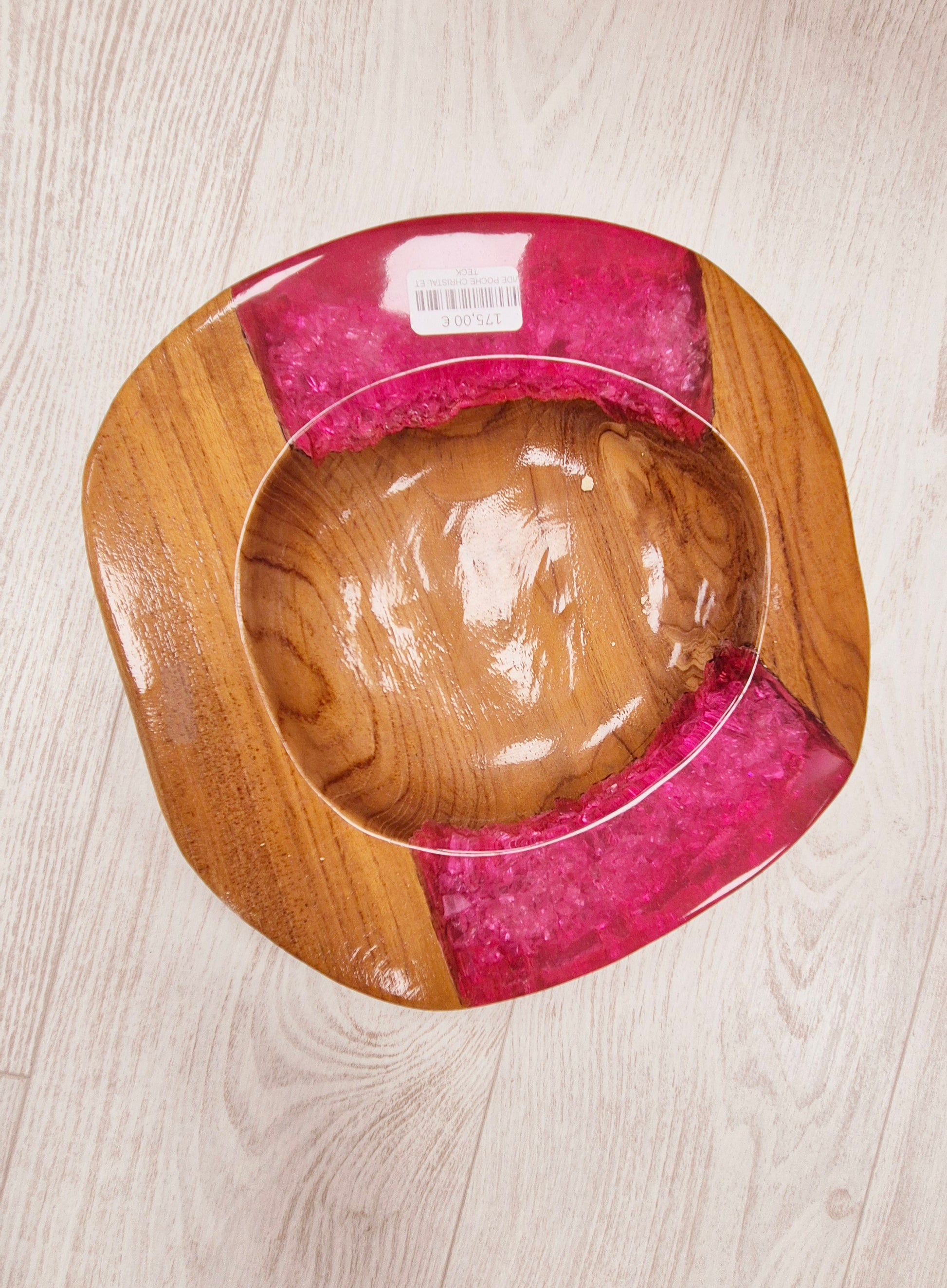 Découvrez cette coupelle unique en bois de teck massif et résine, sublimée par une délicate incrustation de verre qui lui apporte luminosité et modernité. Chaque pièce est façonnée à la main, mettant en valeur la richesse des veines du teck associée à la transparence élégante du verre.